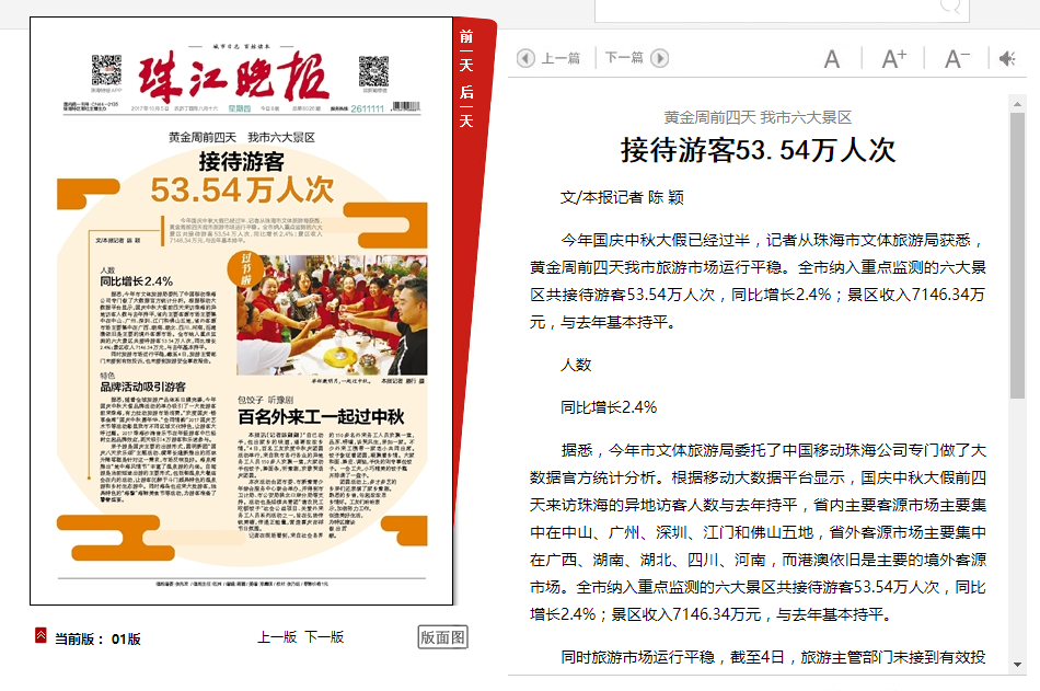 珠江晚報:黃金周前四天 我市六大景區(qū) 接待游客53.54萬人次