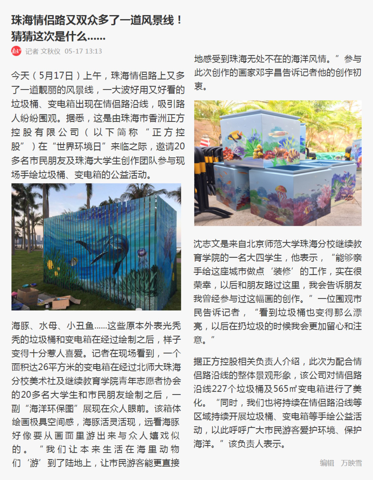 今天(5月17日)上午,珠海情侶路上又多了一道靚麗的風(fēng)景線,一大波好用又好看的垃圾桶、變電箱出現(xiàn)在情侶路沿線,吸引路人紛紛圍觀。據(jù)悉,這是由珠海市香洲正方控股有限公司(以下簡(jiǎn)稱“正方控股”)在“世界環(huán)境日”來臨之際,邀請(qǐng)20多名市民朋友及珠海大學(xué)生創(chuàng)作團(tuán)隊(duì)參與現(xiàn)場(chǎng)手繪垃圾桶、變電箱的公益活動(dòng)。