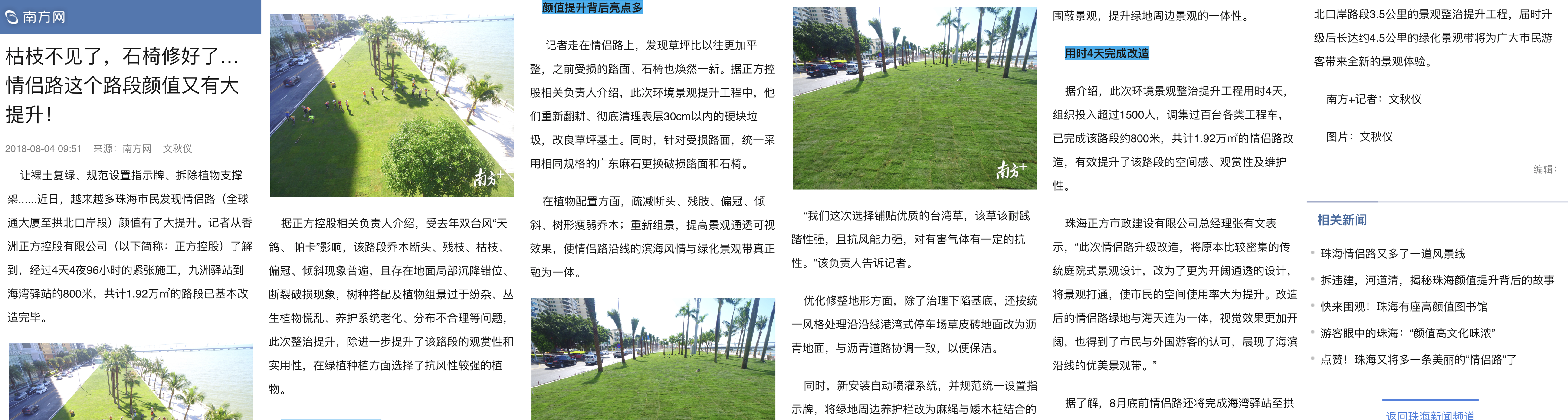 珠海正方市政建設(shè)有限公司總經(jīng)理張有文表示,“此次情侶路升級(jí)改造,將原本比較密集的傳統(tǒng)庭院式景觀設(shè)計(jì),改為了更為開闊通透的設(shè)計(jì),將景觀打通,使市民的空間使用率大為提升。改造后的情侶路綠地與海天連為一體,視覺效果更加開闊,也得到了市民與外國(guó)游客的認(rèn)可,展現(xiàn)了海濱沿線的優(yōu)美景觀帶?!?