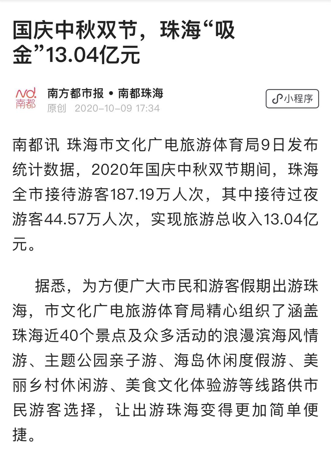 珠海市文化廣電旅游體育局9日發(fā)布統(tǒng)計(jì)數(shù)據(jù),2020年國(guó)慶中秋雙節(jié)期間,珠海全市接待游客187.19萬人次,其中接待過夜游客44.57萬人次,實(shí)現(xiàn)旅游總收入13.04億元。