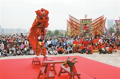 澳門的兩支特邀隊伍此次帶來醒獅表演《三星報喜》和舞龍表演《龍騰飛躍喜洋洋》,隊伍負責(zé)人表示,很高興能參加南屏鎮(zhèn)舉辦的元宵活動,希望未來能加強珠澳龍獅技藝交流,進一步增進珠澳兩地的友好情誼。最后上場的是南屏龍獅聯(lián)盟的舞龍舞獅表演《南屏龍·獅》,12只龍獅一起登場跳躍,將現(xiàn)場氣氛推向最高潮。南屏龍獅聯(lián)盟負責(zé)人告訴記者,南屏鎮(zhèn)有著近百年的舞龍舞獅傳統(tǒng),近年來在南屏鎮(zhèn)政府的大力推動下,已經(jīng)重組8個社區(qū)獅隊,還組建了南屏中學(xué)醒獅隊,讓越來越多的年輕人加入到龍獅隊伍中,為傳統(tǒng)龍獅文化注入時代新活力。