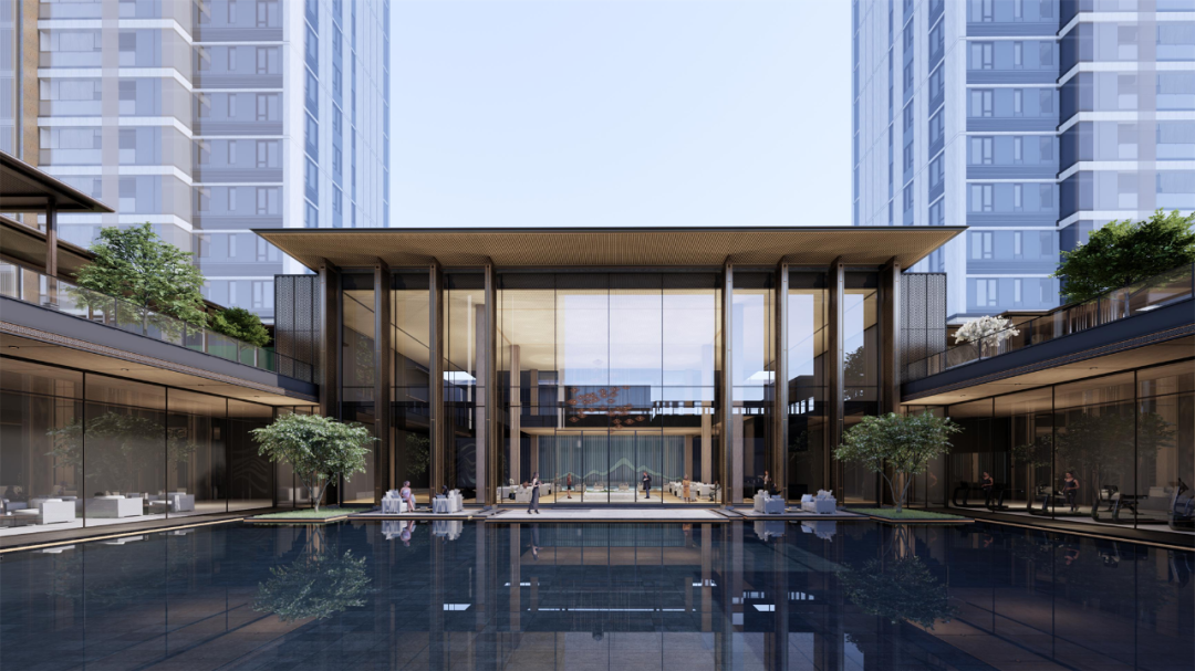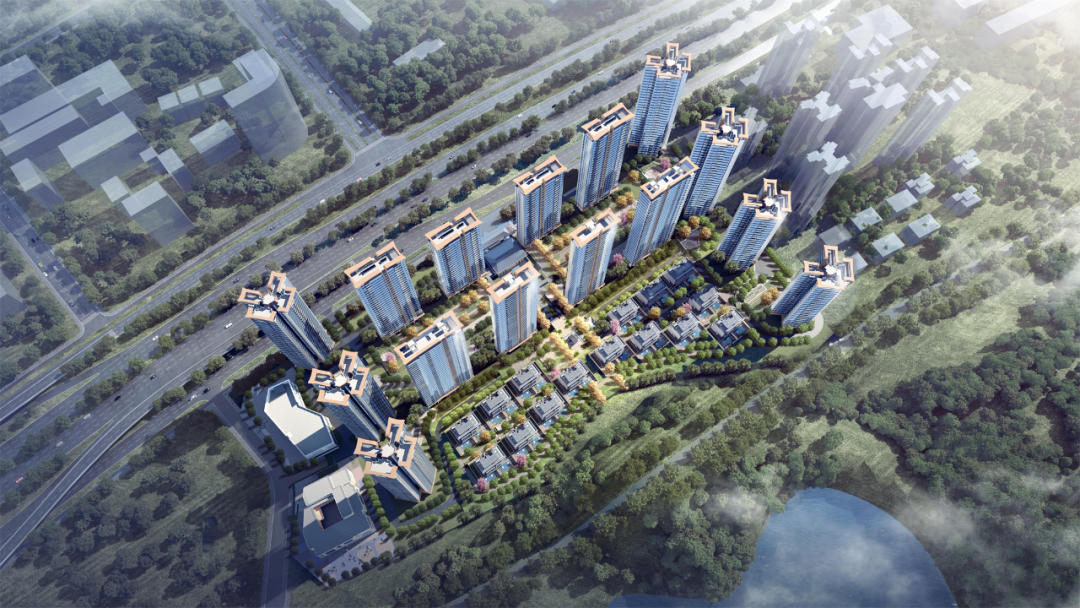 在大師團隊的妙筆下,整個項目規(guī)劃建設(shè)7棟塔樓、8棟板樓、15棟疊墅,高層圍繞南面的黑白面將軍山和南屏水庫形成為圍合之勢,將面寬1000m的湖景和5000m的山景資源最大化,實現(xiàn)建筑與外部環(huán)境的融合協(xié)調(diào)。