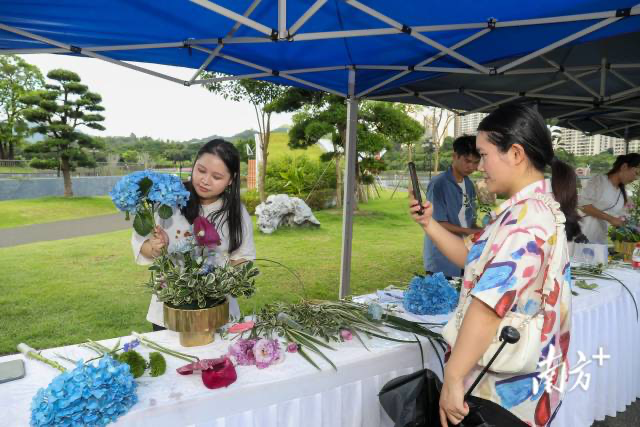據(jù)了解,香洲區(qū)首屆園藝景觀大賽包含了“綠美街巷”“街頭景觀”“理想花園”“花植風(fēng)采”“藝術(shù)插花”等比賽。頒獎(jiǎng)前,大賽舉行了最后一場(chǎng)比拼——“藝術(shù)插花”比賽。決賽選手根據(jù)現(xiàn)場(chǎng)提供的花卉素材,開始他們的藝術(shù)創(chuàng)作。評(píng)審反復(fù)觀察,為選手的作品打分。來賓們也紛紛前來觀看,交流插花藝術(shù)經(jīng)驗(yàn)。