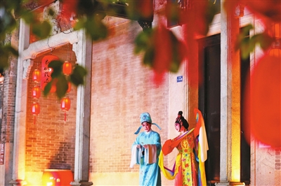 山房路上的無用手工紡織傳習館前,婉轉(zhuǎn)粵韻在百年祠堂間飄揚,中國戲劇梅花獎得主瓊霞和來自香港的粵劇藝術(shù)家黃偉坤帶來了《紫釵記之燈街拾翠》,古建筑與傳統(tǒng)曲藝交相輝映,古典美與建筑美相互映照,讓觀眾身臨其境感受珠海歷史人文底蘊及傳統(tǒng)文化魅力。