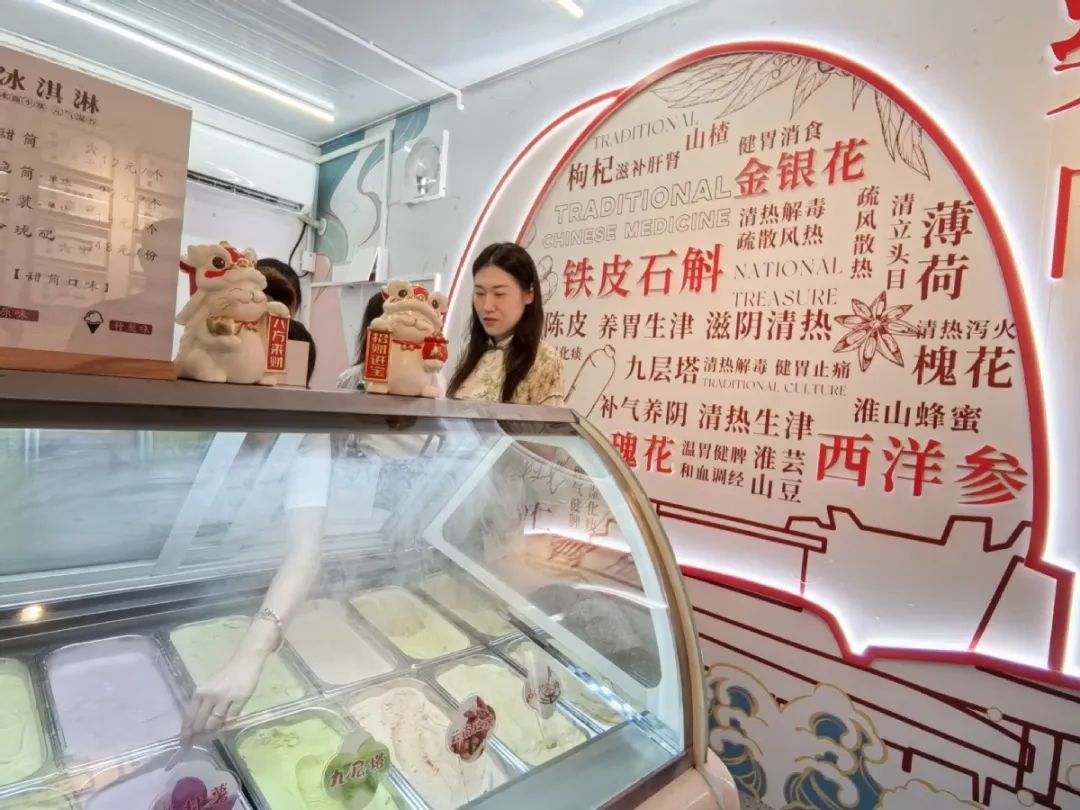 中藥養(yǎng)生冰淇淋店內(nèi),由具有散寒解表功效的小黃姜制成的“姜香沁雪”、由活血明目功效的古法醬油制成的“醬韻幽雪”等倍受年輕人青睞。