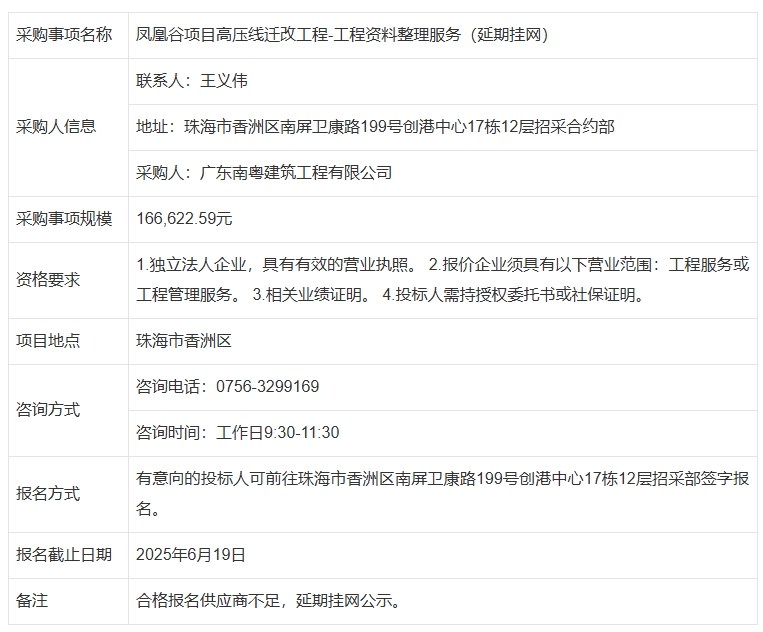 鳳凰谷項(xiàng)目高壓線遷改工程-工程資料整理服務(wù)(延期掛網(wǎng)) 專欄:工程招標(biāo) 發(fā)布日期: 2025-06-16 作者:招采管理中心 附件:測試文檔 附件:測試文檔 返回列表 上一篇:南屏科技工業(yè)園第二批道路綜合改造提升工程項(xiàng)目-市政排水管網(wǎng)移交整改(屏北二路飛天利商混路段)專業(yè)分包招標(biāo) 下一篇:G105國道綜合提升工程設(shè)計(jì)施工總承包項(xiàng)目-工程資料歸檔服務(wù)(延期掛網(wǎng))