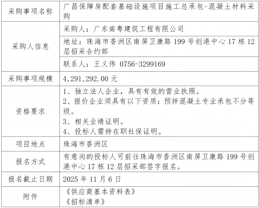 廣昌保障房配套基礎(chǔ)設(shè)施項(xiàng)目施工總承包-混凝土材料采購(gòu) 專(zhuān)欄:工程招標(biāo) 發(fā)布日期: 2025-11-03 作者:招采管理中心 附件:供應(yīng)商基本資料表 附件:廣昌保障房配套基礎(chǔ)設(shè)施項(xiàng)目施工總承包-混凝土材料采購(gòu)招標(biāo)清單 返回列表 上一篇:廣昌保障房配套基礎(chǔ)設(shè)施項(xiàng)目施工總承包-實(shí)名制系統(tǒng)考勤機(jī)升級(jí)、環(huán)境監(jiān)測(cè)系統(tǒng)、視頻監(jiān)控 下一篇:鳳凰山山地步道項(xiàng)目(香山湖公園至海天公園段)-全線整改、維修工程專(zhuān)業(yè)分包(延期公示)