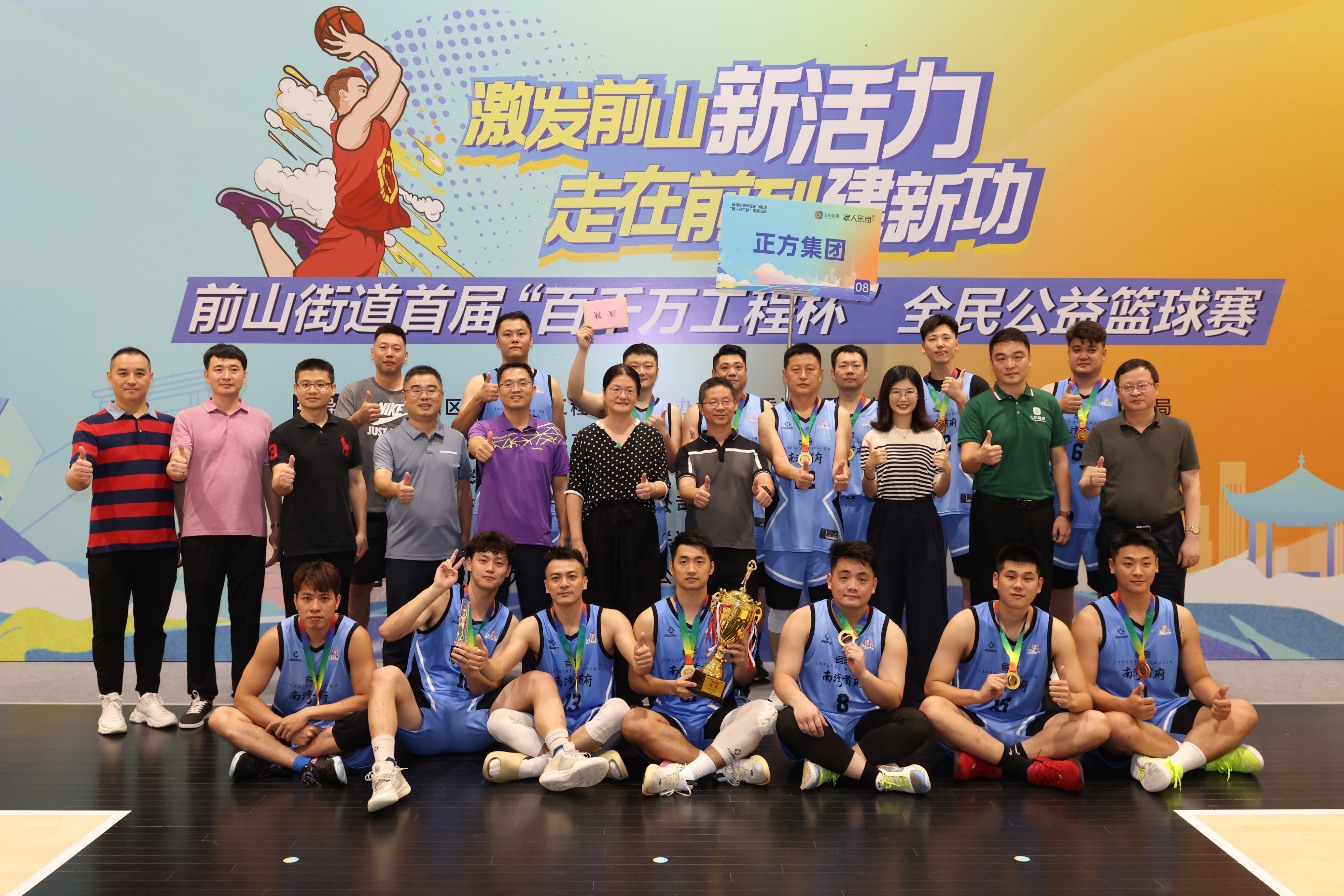 前山街道首屆“百千萬工程杯”全民公益籃球賽中,正方集團籃球隊頑強拼搏、屢克強敵,一路披荊斬棘闖進決賽。8月26日下午,正方集團籃球隊奪得本次比賽冠軍!