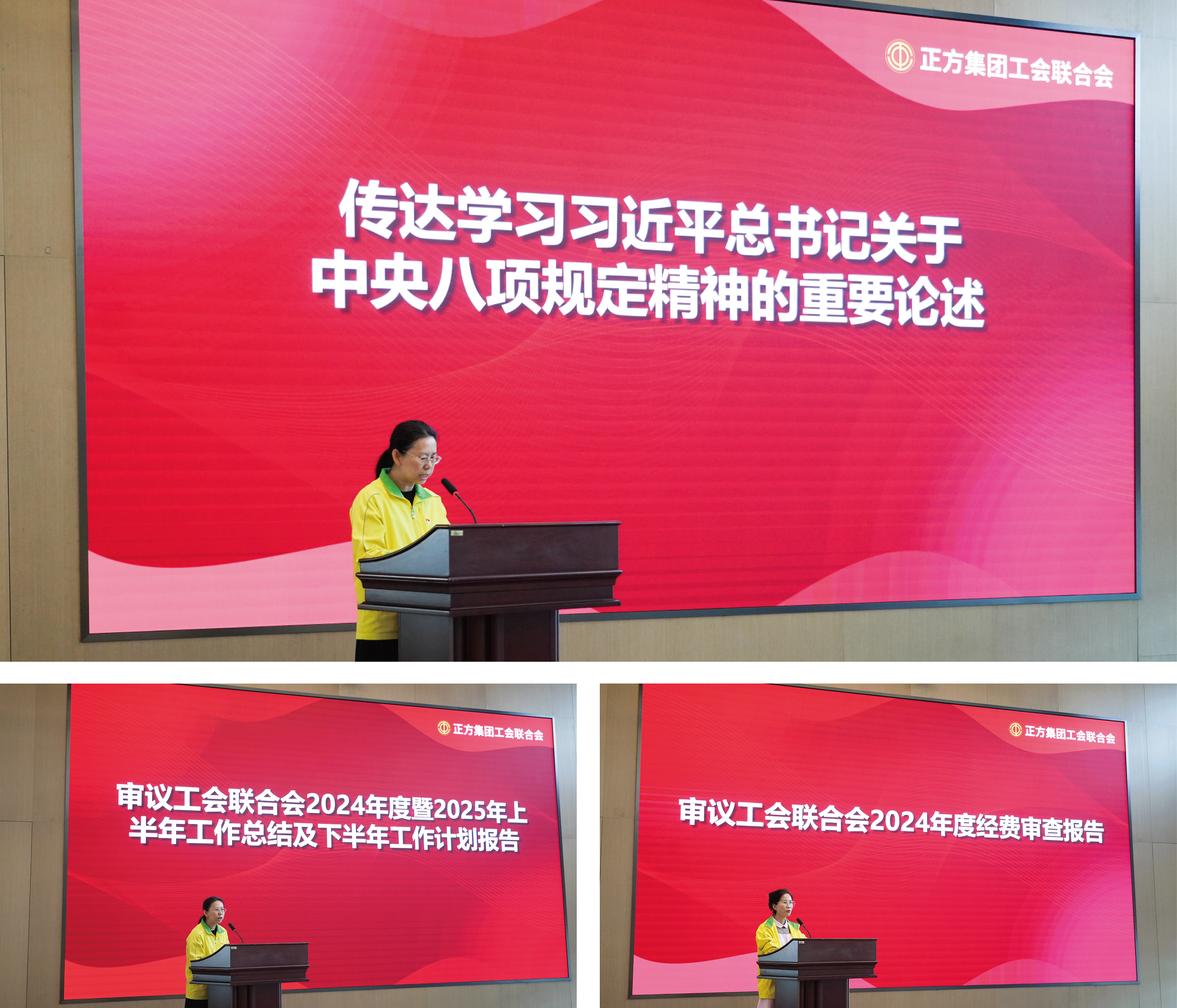 工會聯(lián)合會主席黃少蘭傳達(dá)學(xué)習(xí)習(xí)近平總書記關(guān)于中央八項規(guī)定精神的重要論述,并作《工會聯(lián)合會2024年度暨2025年上半年工作總結(jié)及下半年主要工作計劃報告》。工聯(lián)會經(jīng)審委主任戴鴻作《2024年度經(jīng)費審查報告》。會議審議表決通過了《2025年度主要經(jīng)費預(yù)算》以及《正方集團工會聯(lián)合會社團管理辦法》。